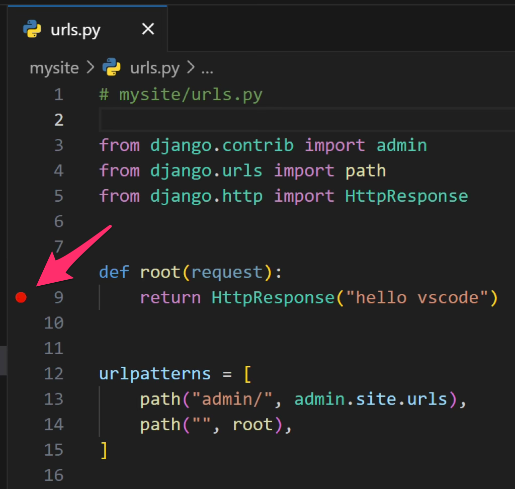 줄번호 왼쪽 영역을 클릭하여 중단점을 생성/제거하실 수 있습니다. 디버거를 실행하면 장고에서 9번 라인이 실행되기 전에 실행이 중단됩니다.