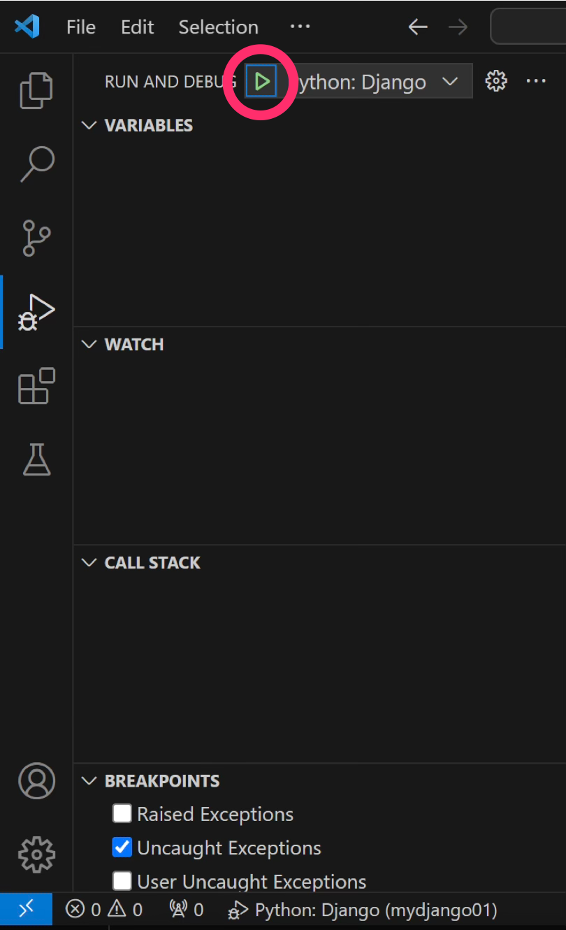 VSCode에서 디버거를 구동하면 장고 서버가 구동되기 때문에, 앞서 터미널에서 구동한 장고 개발서버가 있다면 먼저 꺼주세요.